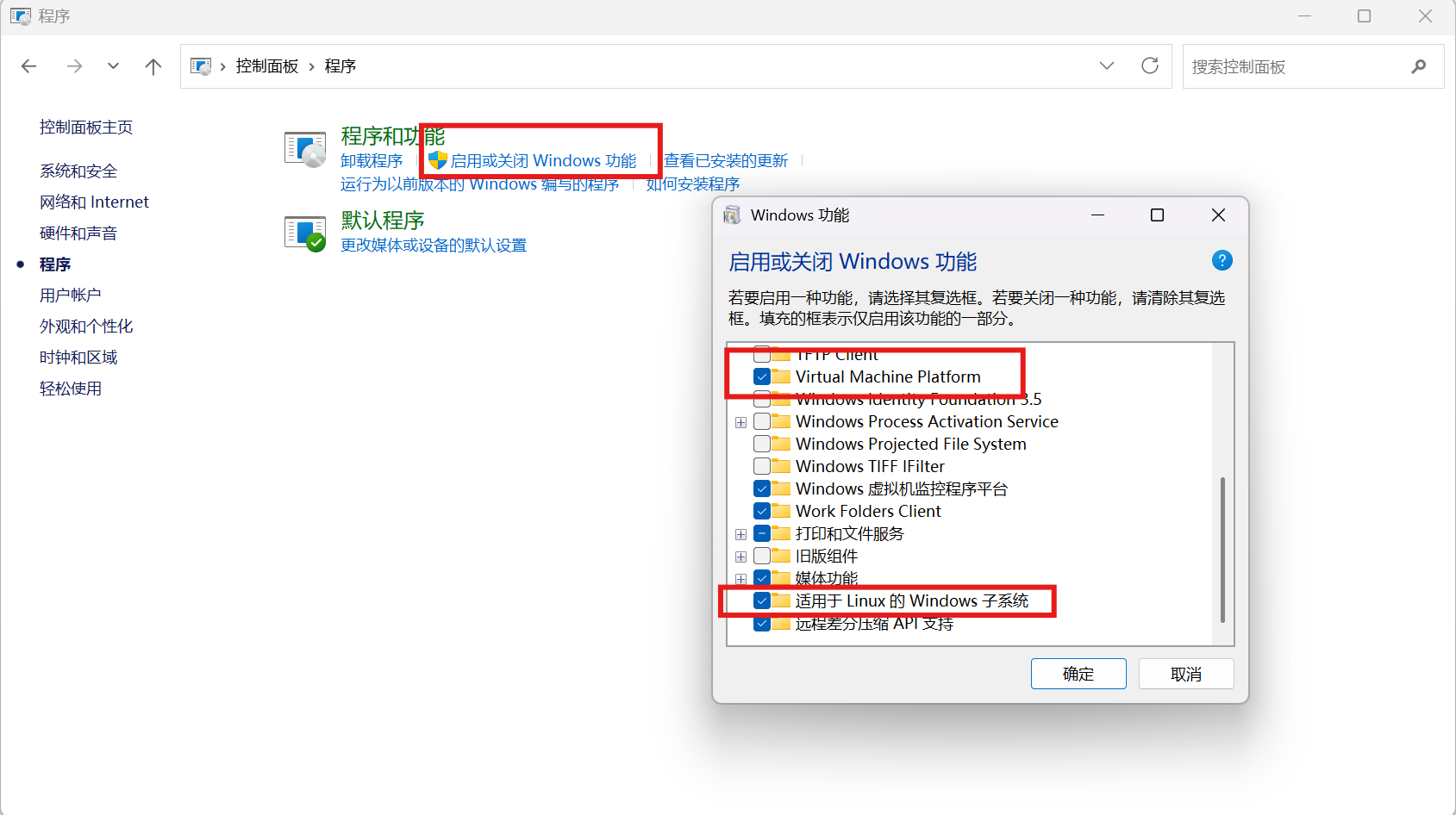 开启“虚拟机平台”(由于Windows11 版本不一致,部分版本该选项为英文 “Virtual Machine Platform”,如下图所示)和“适用于Linux的Windows子系统”两个配