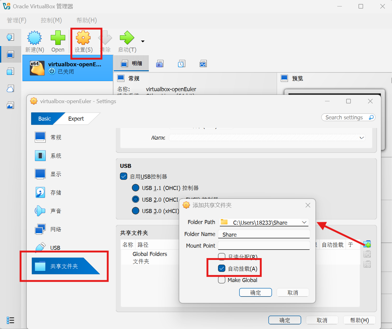 第二步:在VirtualBox中设置共享文件夹