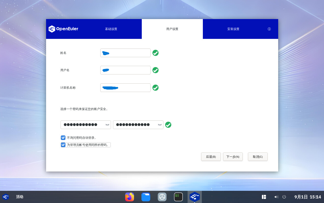 如上图所示,界面选中“为管理员账号使用同样的密码”选项后,管理员账户(即root)的密码与界面设置的用户密码相同,该选项避免多次输入密码(习惯上人们都会趋向于>不同账号设置同一个密码,方便记忆)。相反,当取消选择该选项后,在该页面可以为管理员账号及密码进行单独设置。