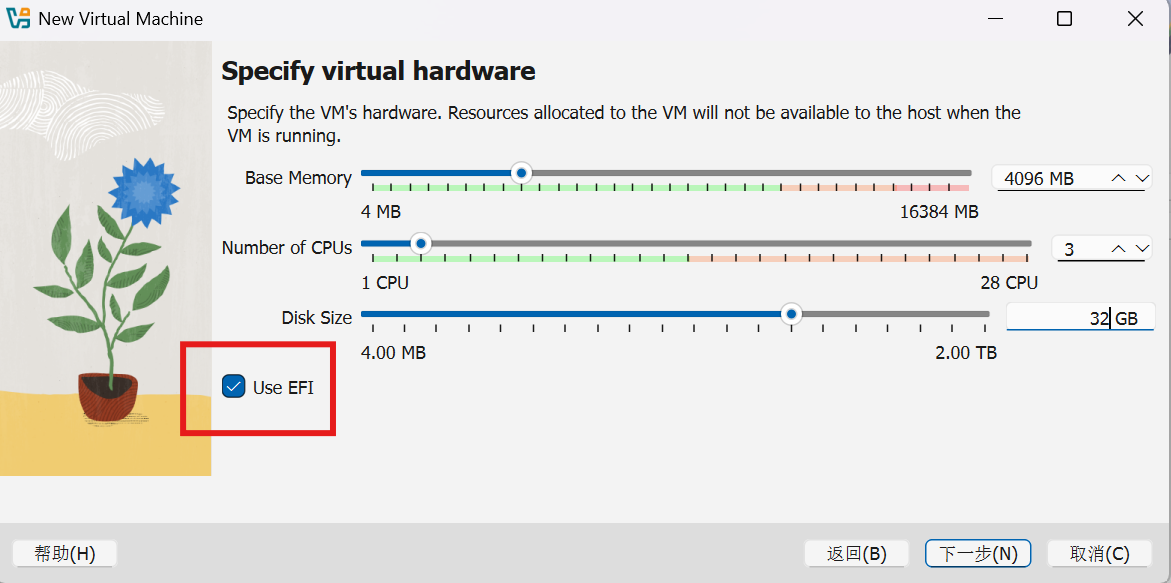 - 选择下一步,在virtual hardware虚机配置页面按个人电脑配置情况将虚机内存、CPU、磁盘大小配置好,建议Base Memory内存配置不小于4G,DiskSize磁盘大小不小于40G,同时勾选“Use EFI”,现代计算机都基本都是UEFI方式启动,接着一路点击下一步即可完成虚拟机创建