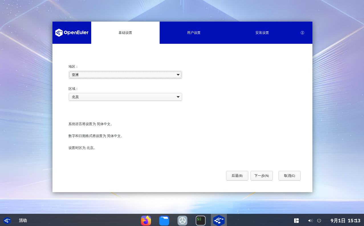 在“基础设置”页面中选择“地区和区域”,设置系统的时区、日期、时间等。