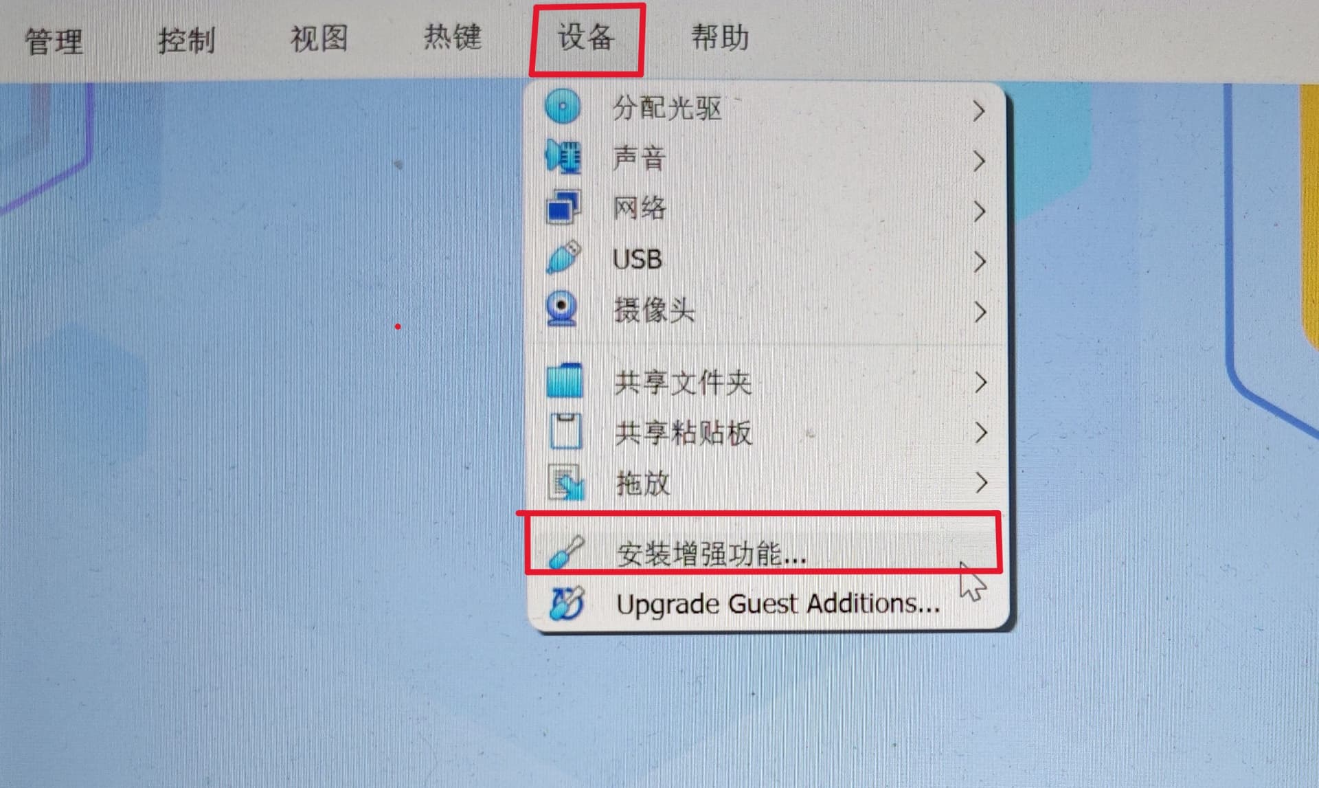 加载虚拟光盘:启动虚拟机并登录到操作系统,在VirtualBox顶部菜单栏,点击 “设备” → “安装增强功能”,如下图,这会自动加载一个虚拟光盘。