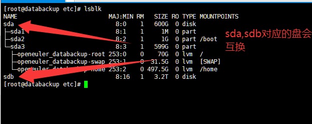 openEuler release 25.09 阵列做的RAID5 , 创建了两个盘卷,现在发现每次重启电脑后,sda,sdb所对应的磁盘卷发生变化,好奇怪,这个要如何处理?因为我在系统中建了几个虚拟机,在虚拟机中使用磁盘直通使用3.2T的盘