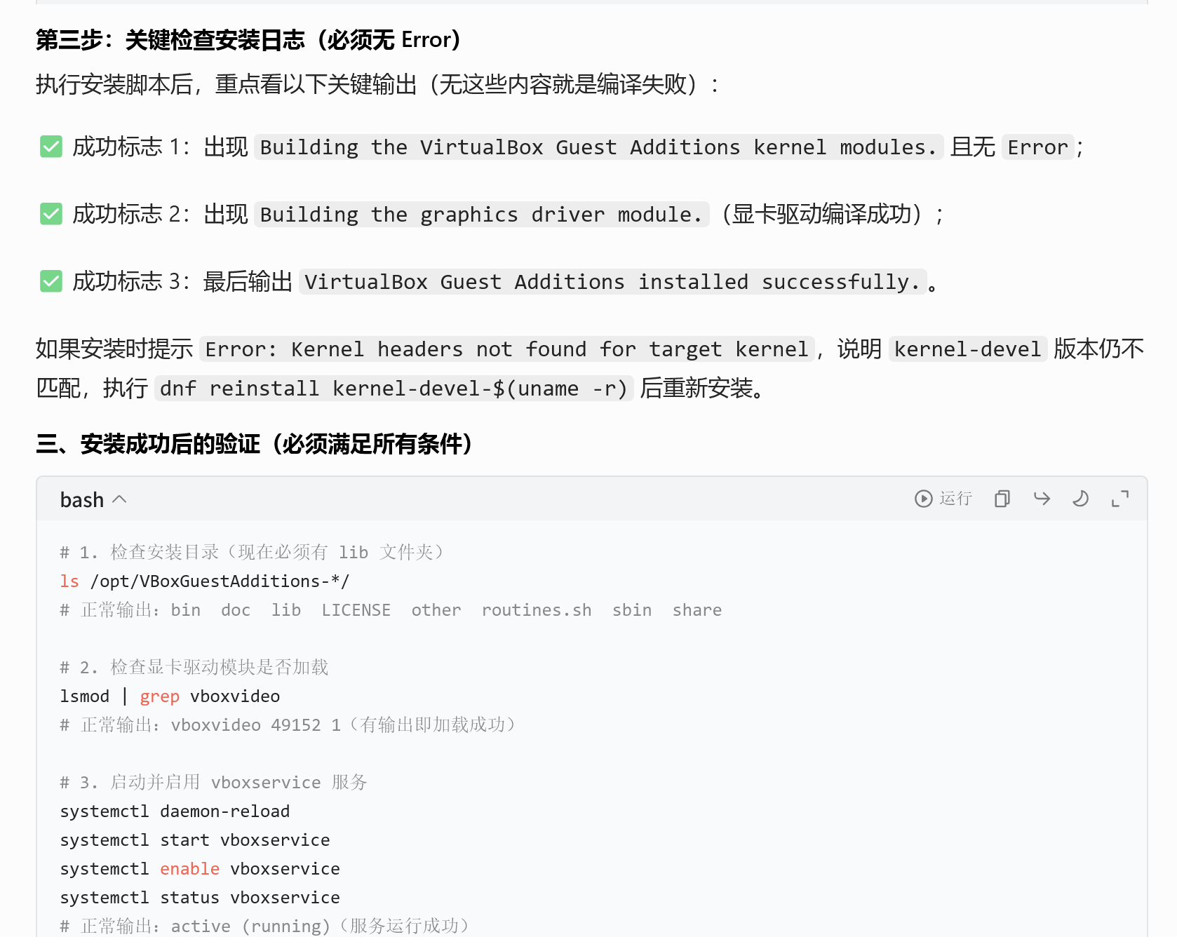 ls /opt/VBoxGuestAdditions-*/ # 正常输出:bin doc lib LICENSE other routines.sh sbin share