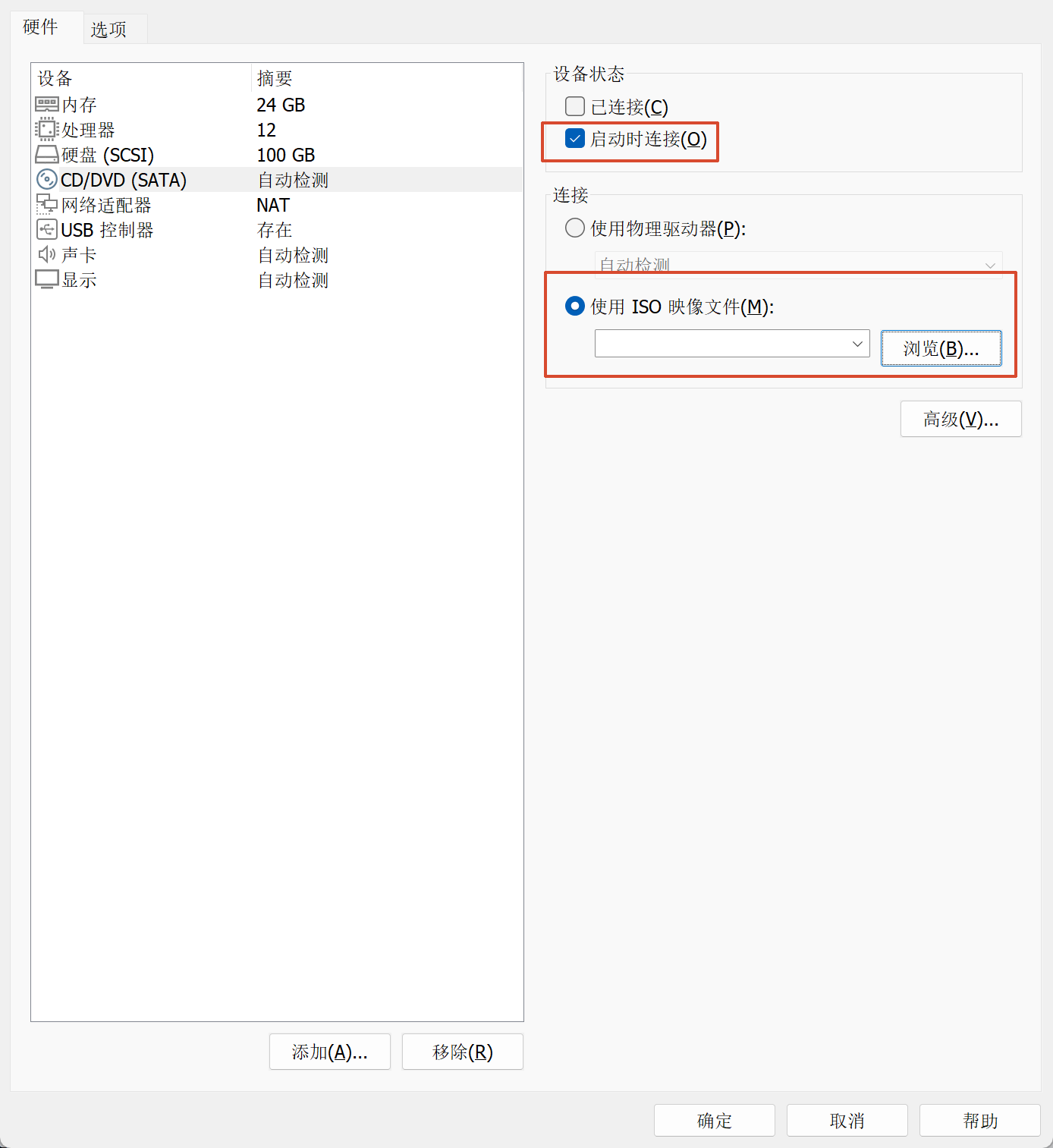 - ISO 镜像未正确挂载到虚拟机的 CD/DVD 驱动器;
