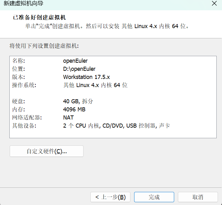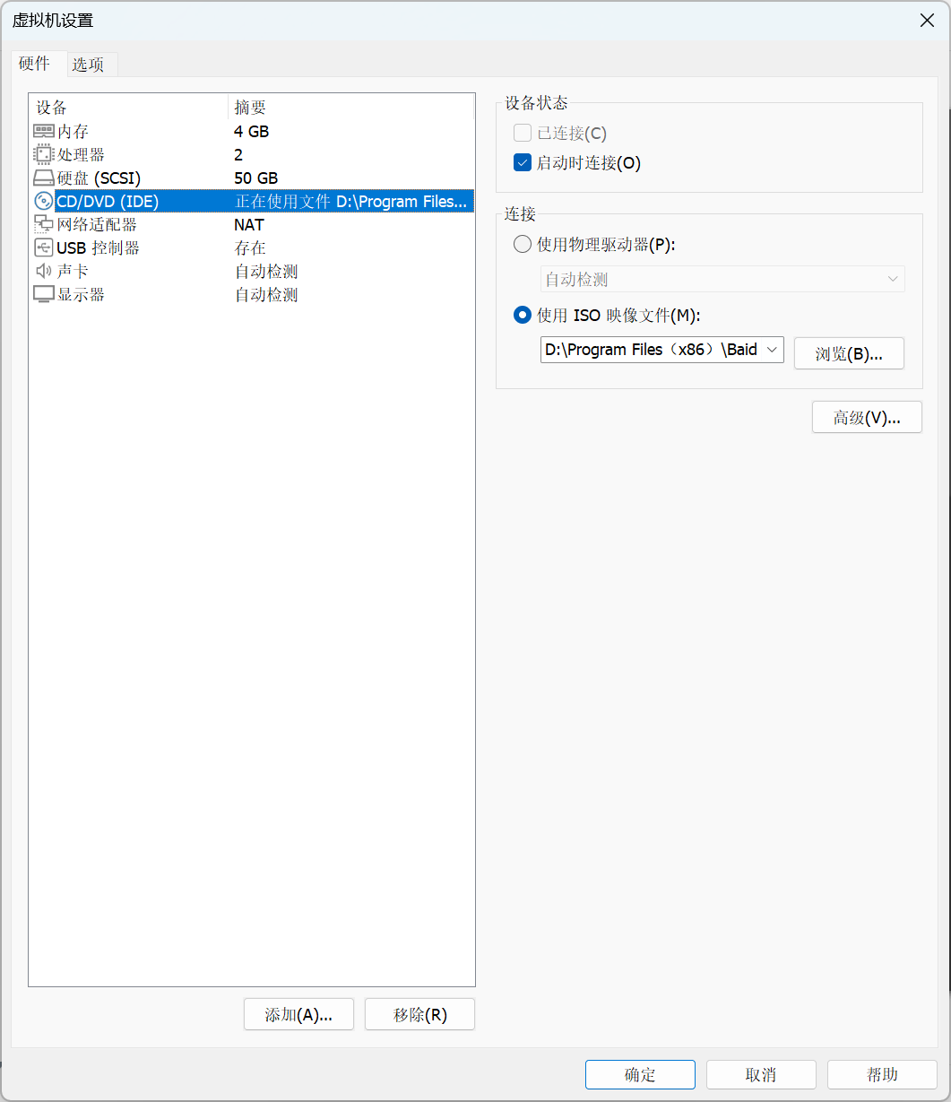 openEuler-22.03-LTS-x86_64-dvd.iso等)。 - 确保勾选 “连接” 和 “启动时连接”。