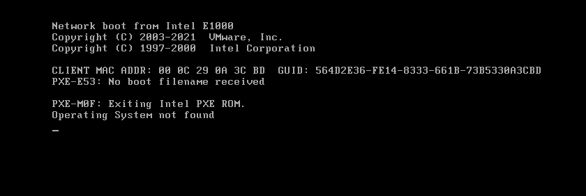 PXE-E53: No boot filename received表示虚拟机的网络适配器(Intel E1000)尝试进行网络启动(PXE Boot),但没有从 DHCP/TFTP 服务器接收到启动文件名。PXE-M0F: Exiting Intel PXE ROM表示 PXE 引导流程已退出。- 最终
