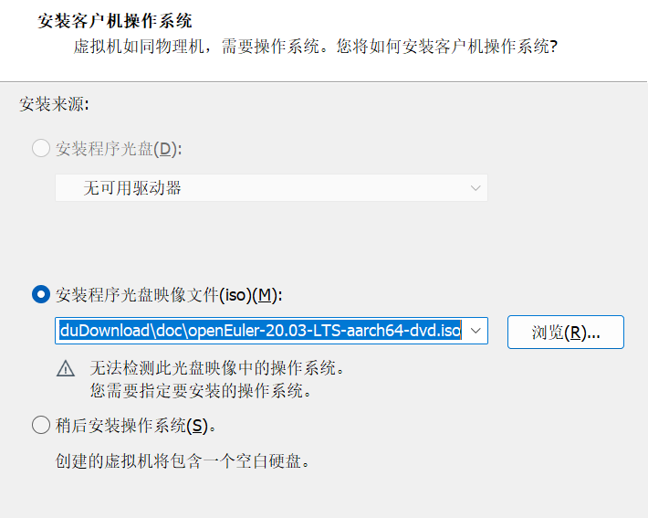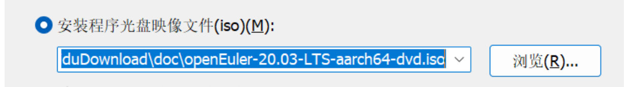 - 勾选 “使用 ISO 映像文件”,并浏览选择您下载的 openEuler ISO 文件(如