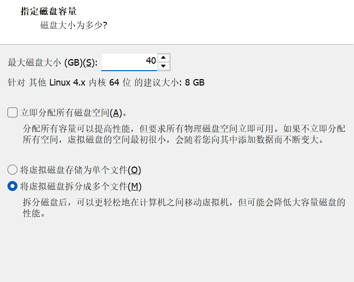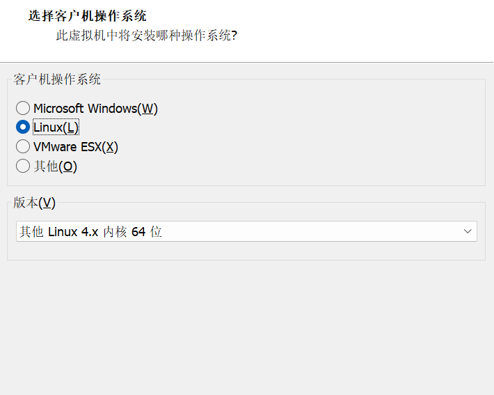 - 客户机操作系统选择 Linux > Other Linux 4.x/5.x 内核 64-bit;